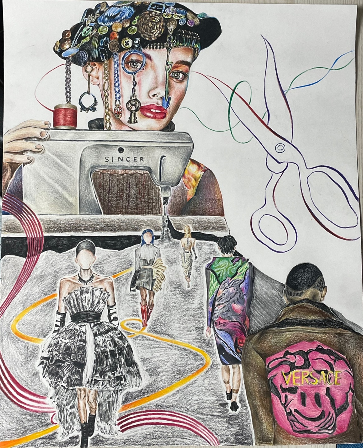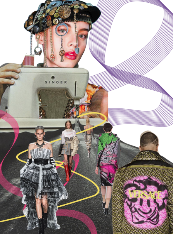재봉틀에서 실이 흘러나오며 옷이 완성되고, 모델의 런웨이로 이어지는 과정을 초현실적 구도로 표현했습니다.